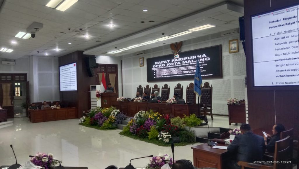 KOTAMALANG(RadarPublik.net) – Tujuh fraksi Dewan Perwakilan Rakyat Daerah (DPRD) Kota Malang menyampaikan pendapat terhadap Laporan Keterangan Pertanggungjawaban (LKPj) Wali Kota Malang Tahun Anggaran 2024 dalam Rapat Paripurna di Ruang Rapat Paripurna DPRD Kota Malang, Senin (24/3/2025). Ketujuh fraksi tersebut yaitu Fraksi PDIP, Golkar, Gerindra, PKB, PKS, Nasdem-PSI, dan Fraksi Damai (Demokrat-PAN).Rapat Paripurna DPRD Kota Malang Penyampaian Pendapat terhadap Laporan Keterangan Pertanggungjawaban (LKPj) Wali Kota Malang Tahun Anggaran 2024(ft)