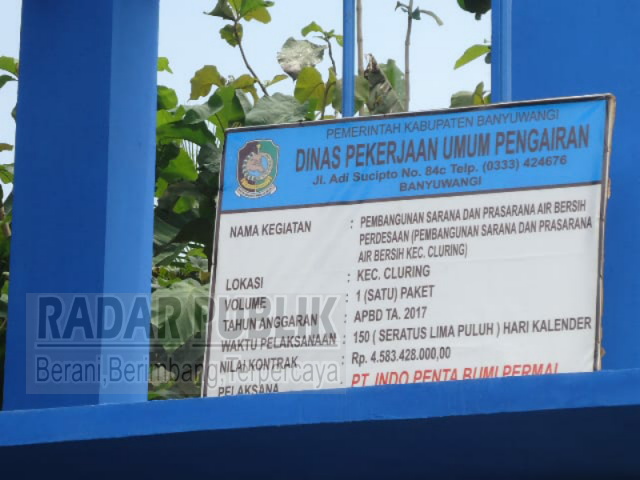Salah satunya proyek pembangunan Sarana prasarana dan Air Bersih Pedesaan yang ada di wilayah kecamatan Cluring, Banyuwangi, Dengan volume satu paket tahun anggaran APBD tahun 2017, Waktu pelaksanaan (150) kelender dengan nilai kontrak seniliai Rp. 4.583.426.000.00 Pelakasana proyek dikerjakan PT. Indo Penta Bumi Permai, Yang menerima proyek air bersih tersebut yakni Desa Sembulung, Cluring, Benculuk, dan Desa Plampangrejo.